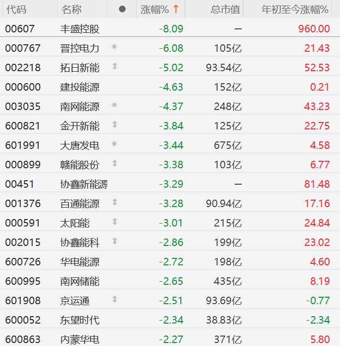 格隆汇2月13日|A股市场电力股普遍下跌,其中,丰盛控股跌8%,晋控电力跌6%,拓日新能跌5%,建投能源、南网能源跌超4%,金开新能、大唐发电、赣能股份、百通能源跌超3%。