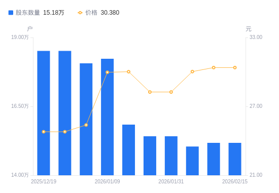 2月24日消息,数据显示,截至2026年2月13日,中航西飞A股股东总户数为15.18万户,较上期(2026年2月10日)增加1303户,增幅0.87%。公司最新A股总股本为27.81亿股,其中流通A股27.73亿股,户均持有流通A股数量为1.83万股,较上期减少158.24股,降幅0.86%;户均持流通A股市值55.51万元,较上期增加1642.98元,增幅0.30%。