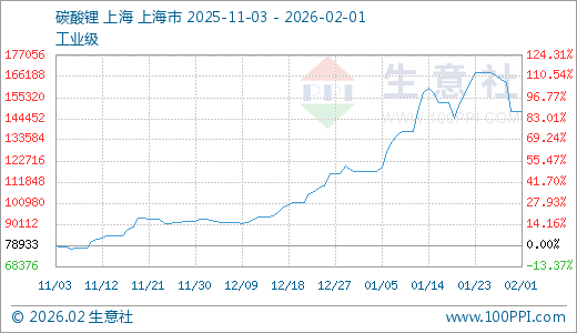 据生意社监测,碳酸锂02月01日最新价格150000.00元/吨,最近30天上涨25.63%,60天上涨59.29%。