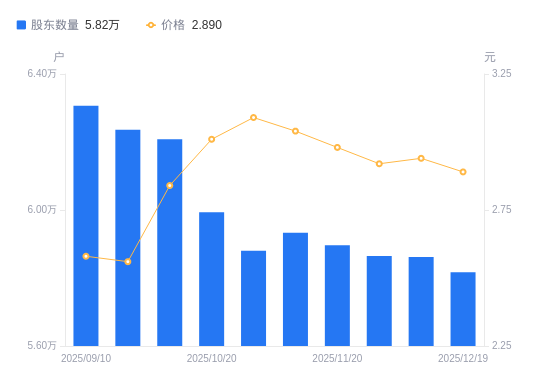 12月22日消息,数据显示,截至2025年12月19日,ST华闻A股股东总户数为5.82万户,较上期(2025年12月10日)减少448户,降幅0.76%。公司最新A股总股本为19.97亿股,其中流通A股19.61亿股,户均持有流通A股数量为3.37万股,较上期增加257.67股,增幅0.77%;户均持流通A股市值9.74万元,较上期减少928.11元,降幅0.94%。