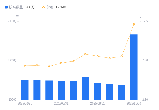 2月9日消息,数据显示,截至2026年1月31日,中水渔业A股股东总户数为3.86万户,较上期(2025年11月30日)减少2.14万户,降幅35.73%。公司最新A股总股本为3.66亿股,其中流通A股3.66亿股,户均持有流通A股数量为9484.75股,较上期增加3388.49股,增幅55.58%;户均持流通A股市值10.95万元,较上期增加3.55万元,增幅48.02%。