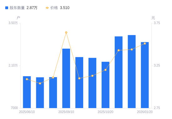 近一年(2025年1月27日至2026年1月20日),和展能源A股股东户数从1.4万户,增加至2.87万户,增幅105.72%,区间股价上涨17.79%。
