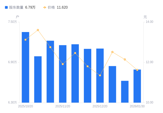 2月2日消息,数据显示,截至2026年1月30日,创维数字A股股东总户数为6.79万户,较上期(2026年1月20日)增加1681户,增幅2.54%。公司最新A股总股本为11.5亿股,其中流通A股11.11亿股,户均持有流通A股数量为1.64万股,较上期减少414.97股,降幅2.47%;户均持流通A股市值19万元,较上期减少1.35万元,降幅6.65%。