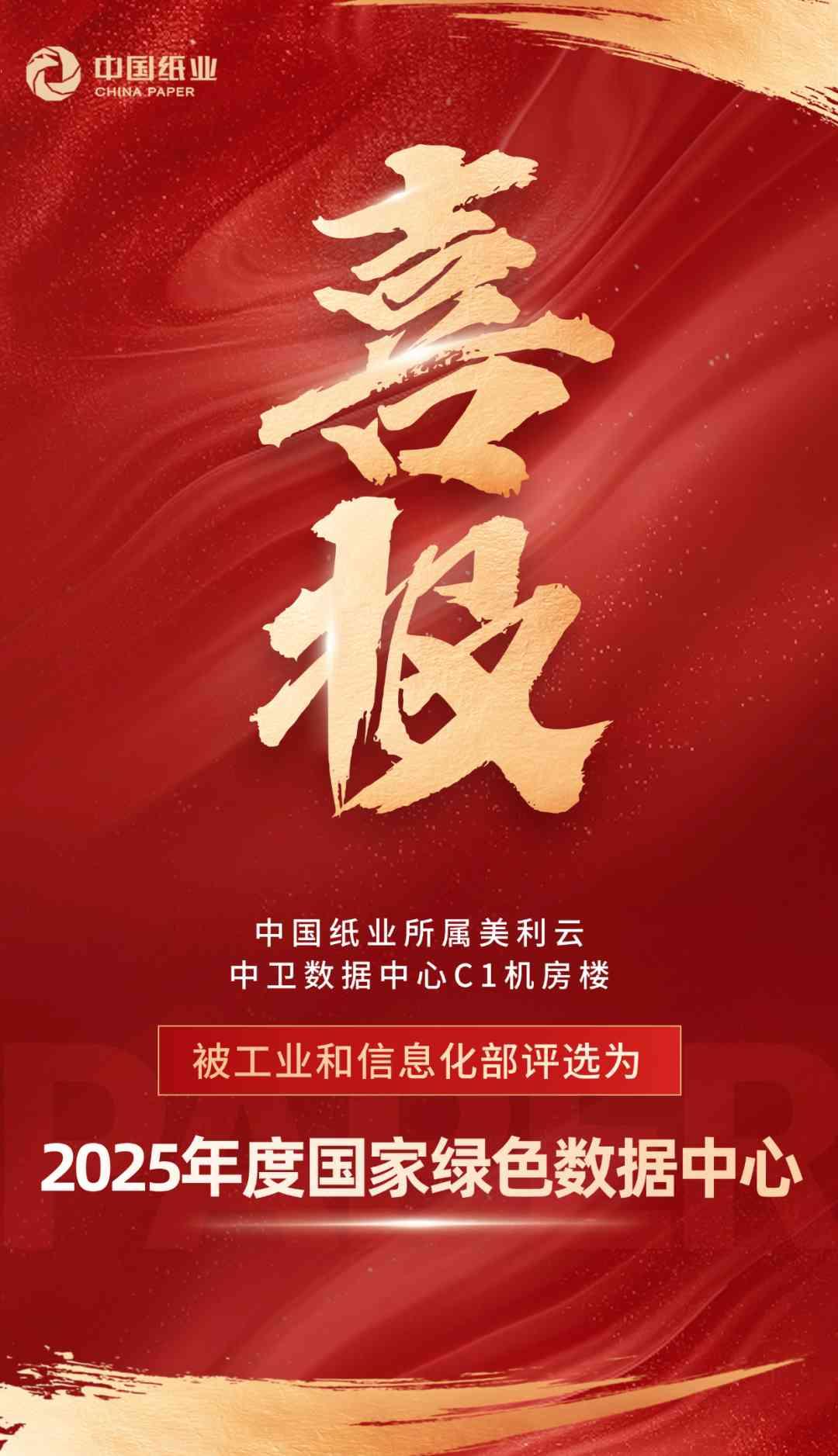 近日,中国纸业所属美利云(000815)中卫数据中心C1机房楼被工业和信息化部评选为2025年度国家绿色数据中心。此次获评,不仅是对公司绿色算力实践成果的高度认可,更是公司主动履行央企绿色使命的生动体现。