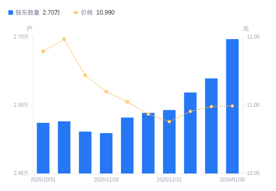 近一年(2025年2月10日至2026年1月30日),东莞控股A股股东户数从2.96万户,减低至2.7万户,降幅9.02%,区间股价上涨10.51%。