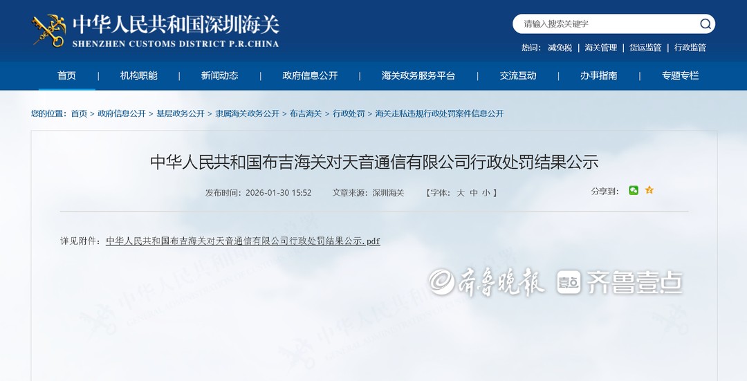 近日,中华人民共和国布吉海关发布对天音通信有限公司行政处罚结果公示。