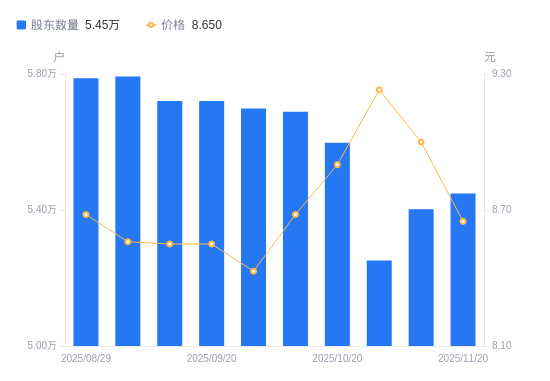 12月1日消息,数据显示,截至2025年11月20日,承德露露A股股东总户数为5.45万户,较上期(2025年11月10日)增加463户,增幅0.86%。公司最新A股总股本为10.21亿股,其中流通A股10.11亿股,户均持有流通A股数量为1.86万股,较上期减少740.48股,降幅3.84%;户均持流通A股市值16.05万元,较上期减少1.32万元,降幅7.58%。