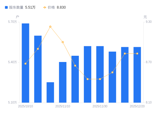 近一年(2025年1月10日至2026年1月10日),承德露露A股股东户数从4.58万户,增加至5.41万户,增幅18.16%,区间股价上涨1.65%。