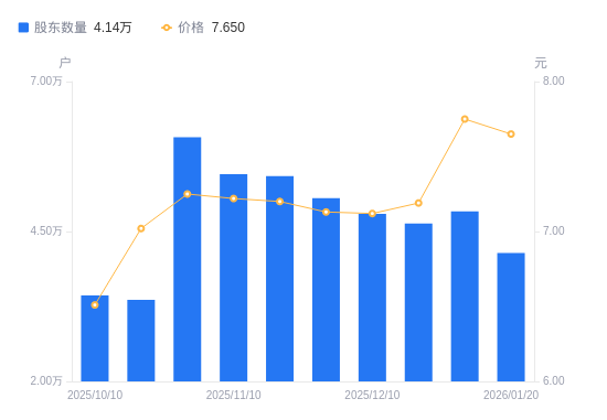 近一年(2025年1月20日至2026年1月20日),石化机械A股股东户数从3.66万户,增加至4.14万户,增幅13.10%,区间股价上涨21.24%。