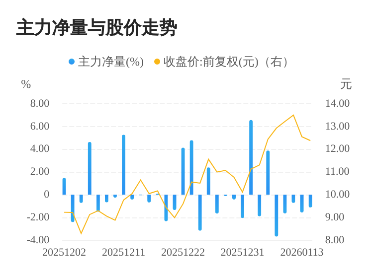 国风新材(000859)01月14日主力(dde大单净额)净流出1.26亿元,涨跌幅为-1.35%,主力净量(dde大单净额/流通股)为-1.12%,两市排名5027/5183。