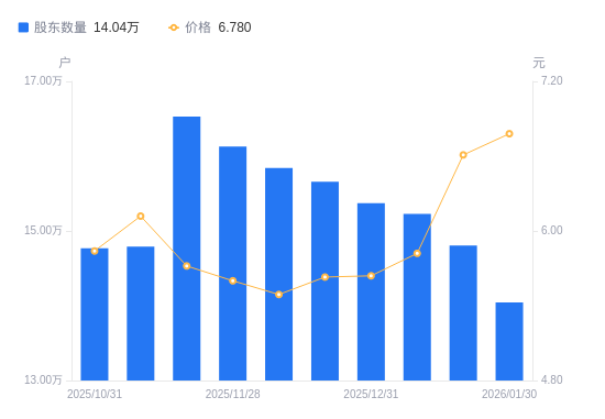 近一年(2025年2月10日至2026年1月30日),吉电股份A股股东户数从16.85万户,减低至14.04万户,降幅16.66%,区间股价上涨30.81%。