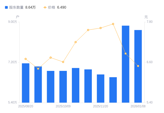 近一年(2025年1月10日至2026年1月8日),海南高速A股股东户数从5.79万户,增加至8.64万户,增幅49.18%,区间股价上涨7.63%。