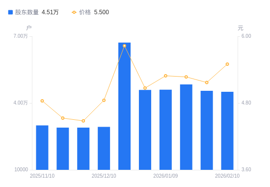 近一年(2025年2月20日至2026年2月10日),法尔胜A股股东户数从3.26万户,增加至4.51万户,增幅38.47%,区间股价上涨47.85%。
