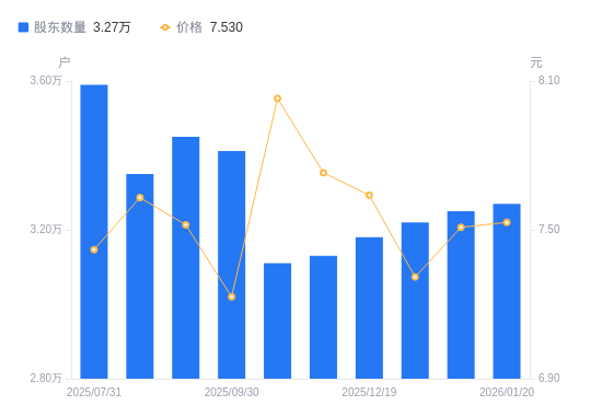 1月21日消息,数据显示,截至2026年1月20日,广农糖业A股股东总户数为3.27万户,较上期(2026年1月9日)增加200户,增幅0.62%。公司最新A股总股本为4亿股,其中流通A股4亿股,户均持有流通A股数量为1.22万股,较上期减少75.34股,降幅0.61%;户均持流通A股市值9.22万元,较上期减少320.93元,降幅0.35%。