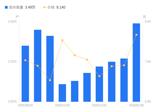 近一年(2025年2月20日至2026年1月30日),广农糖业A股股东户数从3.48万户,增加至3.49万户,增幅0.29%,区间股价上涨16.29%。