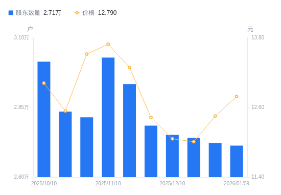 1月16日消息,数据显示,截至2026年1月9日,沃顿科技A股股东总户数为2.71万户,较上期(2025年12月31日)减少94户,降幅0.35%。公司最新A股总股本为4.73亿股,其中流通A股4.73亿股,户均持有流通A股数量为1.74万股,较上期增加60.14股,增幅0.35%;户均持流通A股市值22.28万元,较上期增加6671.02元,增幅3.09%。