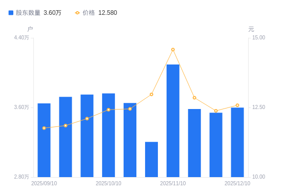 近一年(2024年12月10日至2025年12月10日),佳电股份A股股东户数从2.6万户,增加至3.6万户,增幅38.67%,区间股价上涨4.49%。