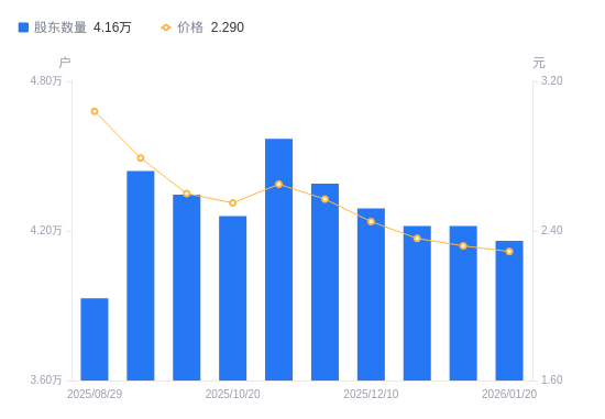 近一年(2025年1月27日至2026年1月20日),福星股份A股股东户数从4.48万户,减低至4.16万户,降幅7.14%,区间股价下跌2.14%。