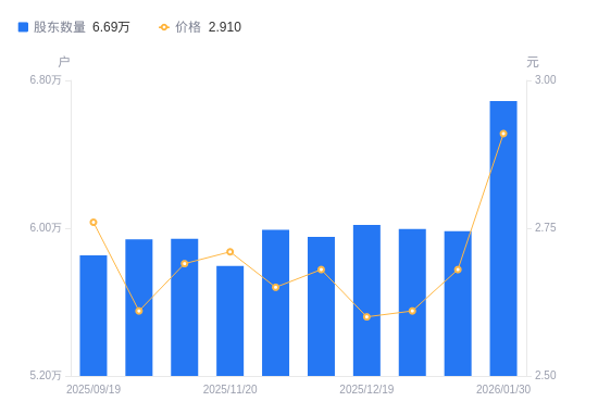 近一年(2025年2月28日至2026年1月30日),中国铁物A股股东户数从6.09万户,增加至6.69万户,增幅9.82%,区间股价上涨17.20%。