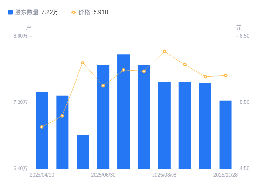近一年(2024年12月20日至2025年11月28日),冀中能源A股股东户数从7.45万户,减低至7.22万户,降幅3.00%,区间股价上涨1.20%。
