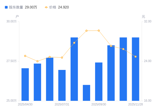 12月3日消息,数据显示,截至2025年11月28日,紫光股份A股股东总户数为29万户,较上期(2025年11月10日)不变。公司最新A股总股本为28.6亿股,其中流通A股28.6亿股,户均持有流通A股数量为9862.34股,较上期不变;户均持流通A股市值24.58万元,较上期减少1.51万元,降幅5.78%。