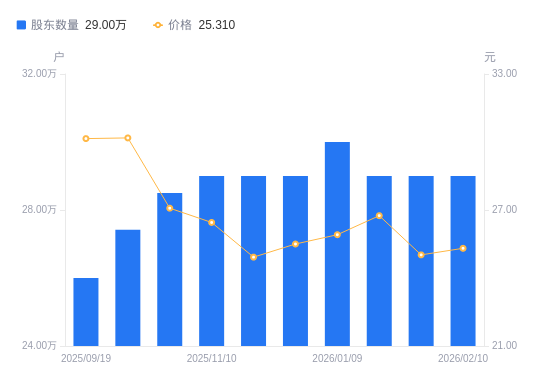 近一年(2025年3月31日至2026年2月10日),紫光股份A股股东户数从27.48万户,增加至29万户,增幅5.53%,区间股价下跌7.64%。