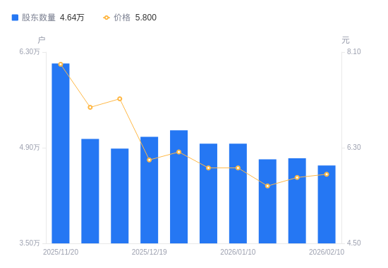 2月11日消息,数据显示,截至2026年2月10日,欣龙控股A股股东总户数为4.64万户,较上期(2026年1月31日)减少1075户,降幅2.26%。公司最新A股总股本为5.38亿股,其中流通A股5.38亿股,户均持有流通A股数量为1.16万股,较上期增加262.8股,增幅2.32%;户均持流通A股市值6.73万元,较上期增加2204.71元,增幅3.39%。