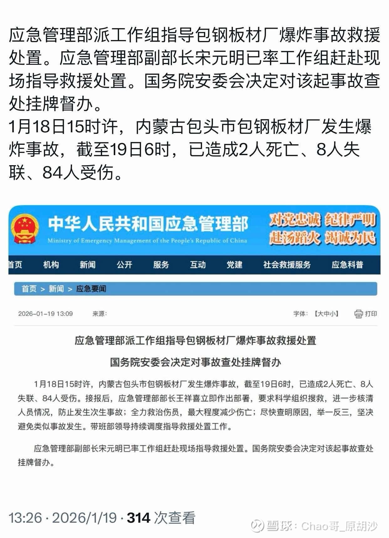 :目前死亡2人,失联8人,重伤5人,轻伤79人。 安全是工业生产的底线,是红线,不是环保那种可以睁一只眼闭一只眼的问题,应急管理部...