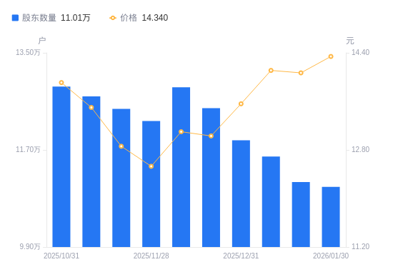 近一年(2025年2月10日至2026年1月30日),中科三环A股股东户数从9.76万户,增加至11.01万户,增幅12.90%,区间股价上涨28.49%。