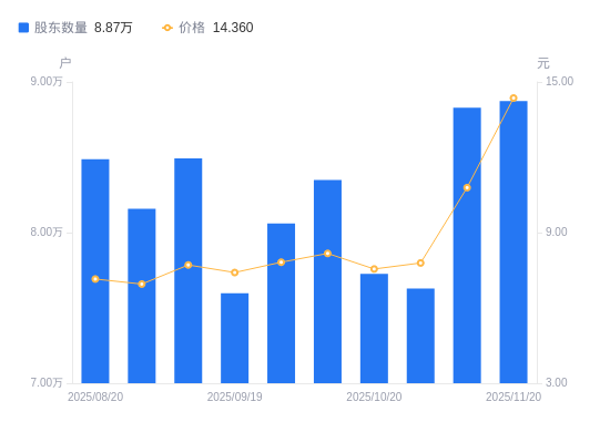 近一年(2024年11月20日至2025年11月20日),佛塑科技A股股东户数从6.3万户,增加至8.87万户,增幅40.77%,区间股价上涨90.07%。