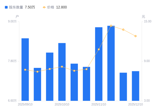 近一年(2024年12月10日至2025年12月10日),佛塑科技A股股东户数从9.82万户,减低至7.5万户,降幅23.65%,区间股价上涨88.10%。