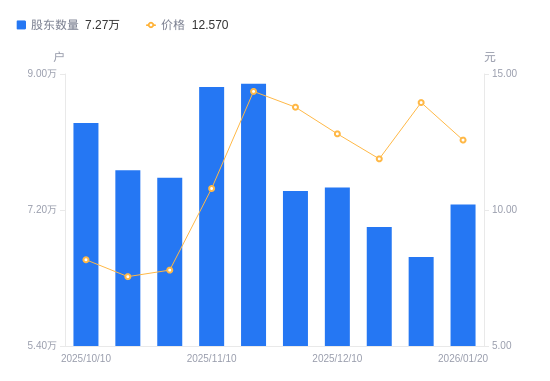 1月22日消息,数据显示,截至2026年1月20日,佛塑科技A股股东总户数为7.27万户,较上期(2026年1月9日)增加6953户,增幅10.57%。公司最新A股总股本为9.67亿股,其中流通A股9.67亿股,户均持有流通A股数量为1.33万股,较上期减少1406.58股,降幅9.56%;户均持流通A股市值16.72万元,较上期减少3.8万元,降幅18.51%。