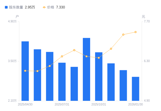 近一年(2025年2月28日至2026年1月30日),桂林旅游A股股东户数从3.74万户,减低至2.95万户,降幅21.28%,区间股价上涨18.23%。