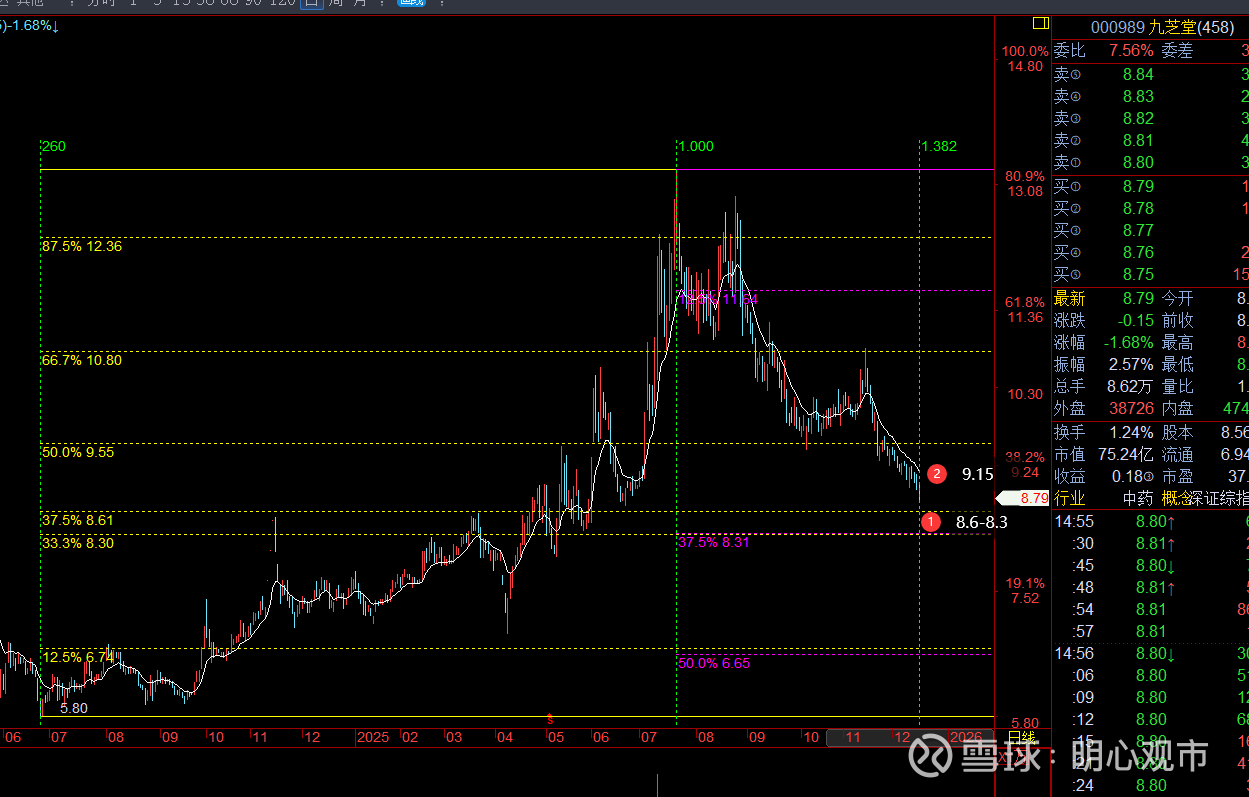 今天是382窗口,空间上探到了3分价格区,主跌时间结束,目前看在8.6-8.3价格区止跌概率大,反压9.15,能站回则转安全,届时再跟踪反弹空间;风控参考8.3
