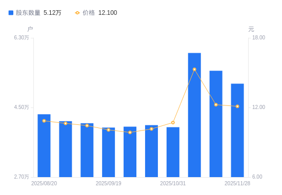 12月8日消息,数据显示,截至2025年11月28日,闽东电力A股股东总户数为5.12万户,较上期(2025年11月20日)减少3332户,降幅6.11%。公司最新A股总股本为4.58亿股,其中流通A股4.4亿股,户均持有流通A股数量为8596.04股,较上期增加525.65股,增幅6.51%;户均持流通A股市值10.4万元,较上期增加5230.48元,增幅5.29%。