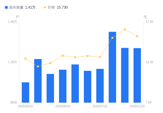 近一年(2024年11月29日至2025年11月20日),炬申股份A股股东户数从9129户,增加至1.41万户,增幅54.57%,区间股价上涨43.36%。