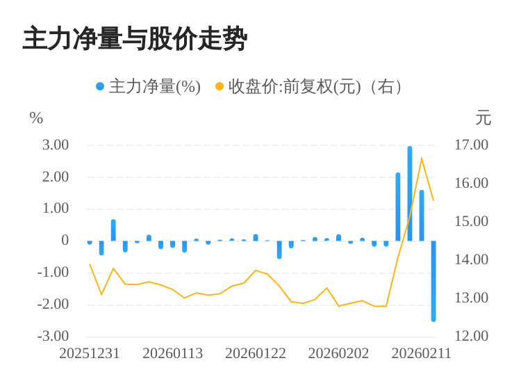 华尔泰(001217)02月12日主力(dde大单净额)净流出1.31亿元,涨跌幅为-6.61%,主力净量(dde大单净额/流通股)为-2.54%,两市排名5179/5190。