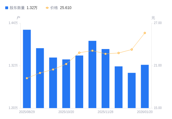 近一年(2025年1月20日至2026年1月20日),丽臣实业A股股东户数从1.29万户,增加至1.32万户,增幅2.38%,区间股价上涨65.65%。