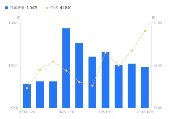 近一年(2025年1月20日至2026年1月20日),速达股份A股股东户数从1.11万户,减低至1.04万户,降幅6.21%,区间股价上涨14.77%。