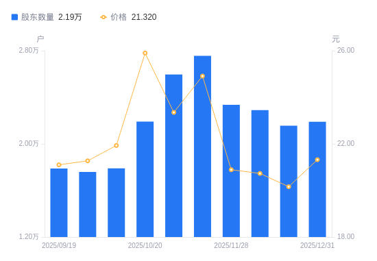 1月12日消息,数据显示,截至2026年1月9日,三联锻造A股股东总户数为2.09万户,较上期(2025年12月31日)减少943户,降幅4.31%。公司最新A股总股本为2.22亿股,其中流通A股7816.48万股,户均持有流通A股数量为3731.19股,较上期增加160.72股,增幅4.50%;户均持流通A股市值7.99万元,较上期增加3799.7元,增幅4.99%。
