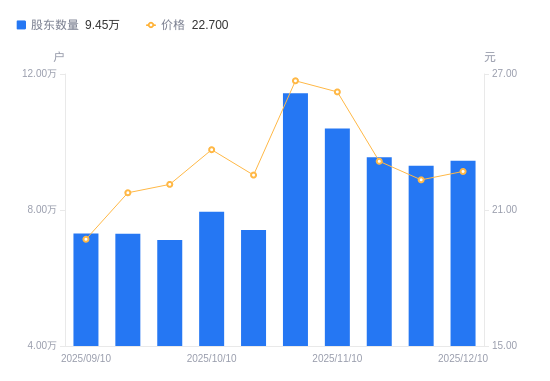 近一年(2024年12月10日至2025年12月10日),中电港A股股东户数从8.26万户,增加至9.45万户,增幅14.36%,区间股价下跌2.65%。
