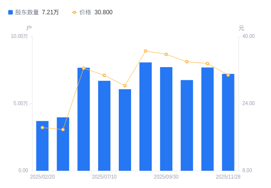 近一年(2024年11月30日至2025年11月28日),好上好A股股东户数从3.64万户,增加至7.21万户,增幅98.28%,区间股价上涨63.71%。