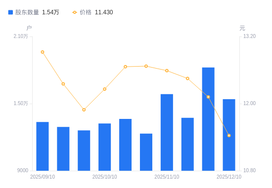12月15日消息,数据显示,截至2025年12月10日,美能能源A股股东总户数为1.54万户,较上期(2025年11月28日)减少2837户,降幅15.56%。公司最新A股总股本为2.43亿股,其中流通A股2.18亿股,户均持有流通A股数量为1.42万股,较上期增加2207.76股,增幅18.43%;户均持流通A股市值16.22万元,较上期增加1.7万元,增幅11.69%。