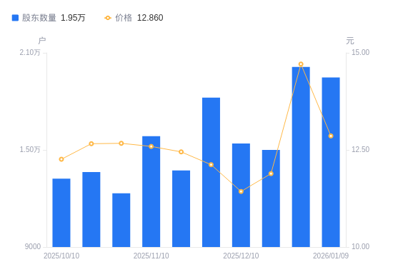 1月12日消息,数据显示,截至2026年1月9日,美能能源A股股东总户数为1.95万户,较上期(2025年12月31日)减少651户,降幅3.23%。公司最新A股总股本为2.43亿股,其中流通A股2.18亿股,户均持有流通A股数量为1.12万股,较上期增加362.49股,增幅3.34%;户均持流通A股市值14.42万元,较上期减少1.54万元,降幅9.66%。