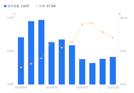 近一年(2024年11月29日至2025年11月28日),尚太科技A股股东户数从1.4万户,增加至1.83万户,增幅30.78%,区间股价上涨18.62%。