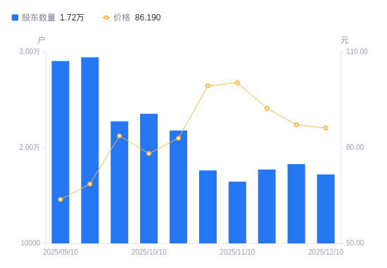 近一年(2024年12月10日至2025年12月10日),尚太科技A股股东户数从1.58万户,增加至1.72万户,增幅8.83%,区间股价上涨27.23%。