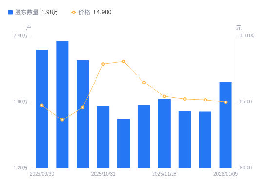 1月15日消息,数据显示,截至2026年1月9日,尚太科技A股股东总户数为1.98万户,较上期(2025年12月31日)增加2666户,增幅15.55%。公司最新A股总股本为2.61亿股,其中流通A股1.62亿股,户均持有流通A股数量为8188.85股,较上期减少1228.64股,降幅13.05%;户均持流通A股市值69.52万元,较上期减少11.29万元,降幅13.97%。