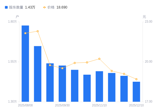 近一年(2024年12月31日至2025年12月10日),长青科技A股股东户数从1.76万户,减低至1.43万户,降幅19.19%,区间股价上涨10.67%。