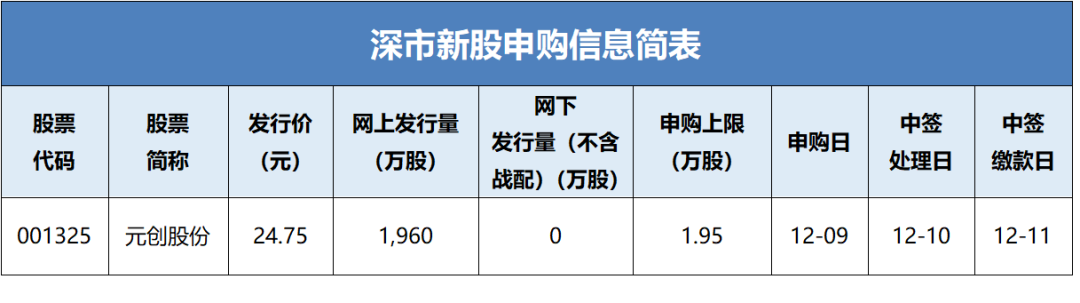 2025年12月9日,元创科技股份有限公司(简称:元创股份)将通过深交所交易系统发行新股,具体信息如下。