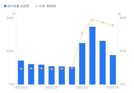2月2日消息,数据显示,截至2026年1月30日,胜通能源A股股东总户数为2.21万户,较上期(2026年1月20日)减少1.07万户,降幅32.55%。公司最新A股总股本为2.82亿股,其中流通A股1.68亿股,户均持有流通A股数量为7583.49股,较上期增加2468.45股,增幅48.26%;户均持流通A股市值40.7万元,较上期增加12.11万元,增幅42.34%。